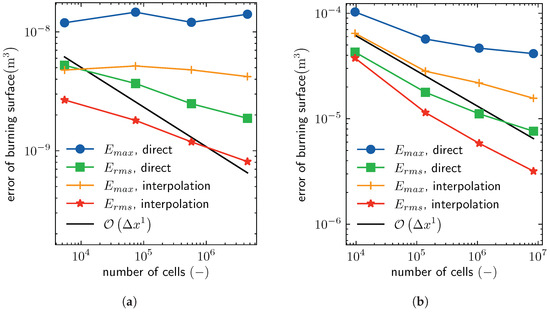 Figure 6 shows the errors over different mesh sizes when calculating the burning surface area. Here, the direct method using the Dirac delta function does not converge. Only the averaged error of the multiport geometry has an order of higher than one (Figure 6d), while in some cases the errors stay constant. This non-convergent behavior could be a result of the regularization version of the Dirac distribution, which is known to be lower than first-order in some cases [42]. Even with better approximations of the Dirac distribution, Cavallini [24] found similar problems with this method. Convergence of the interpolation method is considerable better and, except for the Quasi-1D geometry (Figure 6a), can be seen as a first-order method.