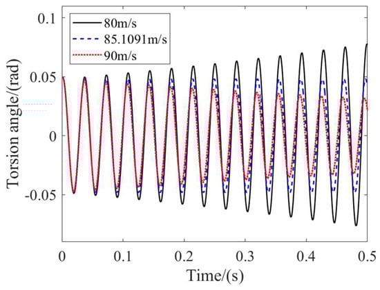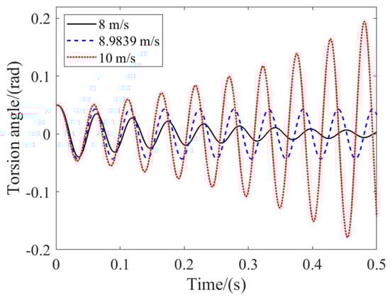 At the critical speed point, the swing angle of the landing gear exhibits constant amplitude vibration. When the speed value is slightly changed, the system’s state either becomes divergent or convergent, thus verifying the accuracy of the derived formula.