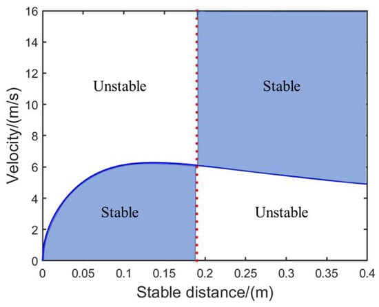 Due to all the parameters being greater than zero, there is a constant critical velocity in the system without considering damping dissipation, which stabilizes the system. We name the sum of the half length of the tire touching the ground and the slack length as the critical stable distance or climbing distance. When the stable distance is less than the crawling distance, we have , and the stability interval of the system is ; when the stable distance is equal to the creep distance, we have , and the stability interval of the system is ; and when the stable distance is less than the crawling distance, we have , and the stability interval of the system is . Therefore, it is possible to draw a stability zone map corresponding to the landing gear stability distance and speed.