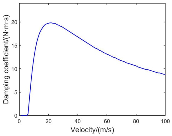 As shown in Figure 7, the analysis reveals that the required anti-swing damping force of the system initially increases and subsequently decreases as the speed escalates. Notably, at a velocity of 21.4 m/s, the maximum damping is achieved with an anti-swing damping value of 19.9 Nms, which aligns consistently with the previous findings. Consequently, it can be inferred that this velocity damping coefficient curve represents the critical damping coefficient essential for ensuring the landing gear’s oscillation stability. Remarkably, the peak critical damping value corresponds to the minimum requirement for overall system stability across all speeds.