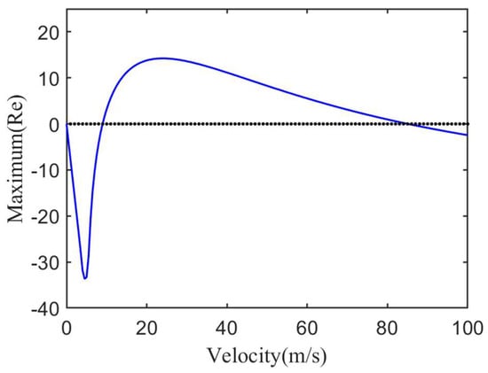The forward taxiing speed of an aircraft is also an important factor affecting shimmy. Usually, the landing gear system is prone to inducing shimmy within a certain speed range during forward sliding, known as shimmy speed. According to the critical speeds of 8.9839 m/s and 85.1091 m/s calculated in the previous section, the two parameters are substituted into the nonlinear analysis: for the critical speed of 8.9839 m/s, their corresponding eigenvalues are and . The calculated is −0.0077. We obtain the first Lyapunov coefficient of the landing gear system according to the formula ; from this, it can be determined that when the speed exceeds 8.9839 m/s, the landing gear system undergoes supercritical Hopf bifurcation. Similarly, for speeds of 85.1091 m/s, their corresponding characteristic values are , , and the calculated is −0.0061. We obtain the first Lyapunov coefficient of the landing gear system according to the formula , and from this, it can be determined that a supercritical Hopf bifurcation occurs in the landing gear system when the speed is below 85.1091 m/s. In order to verify the correctness of the theoretical calculation results, the differential equation of the landing gear system was numerically solved to obtain the curve of the maximum real part of the eigenvalues of the landing gear system under the parameters in Table 1 as a function of the sliding speed, as shown in the Figure 8: