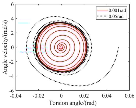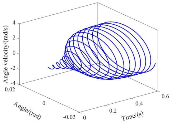 As can be seen in Figure 9, at the current parameter value, the system will gradually approach a state of constant amplitude vibration due to the non-zero initial conditions, leading to the loss of stability in the original neutral equilibrium state. The axes in the phase space represent different state parameters of the system. A point in the phase space signifies the system’s state, while its trajectory forms a phase orbit depicting the evolution of the system’s state over time. Drawing a phase diagram involves representing spatial coordinates for each degree of freedom at a specific time point, enabling analysis of the dynamic motion trends across different spatial states.