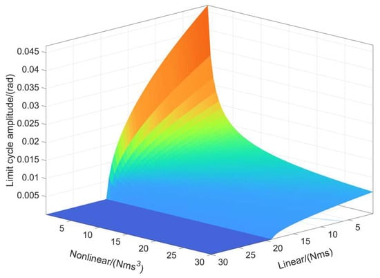 We distribute the nonlinear damping coefficient and linear damping coefficient within a specified range and analyze their impact on the amplitude of the limit cycle, as illustrated in the three-dimensional diagram above Figure 14. The system can only stabilize and converge by increasing the linear damping coefficient. Moreover, during Hopf bifurcation, the amplitude of the limit cycle remains relatively small. In terms of nonlinear coefficients, a limit cycle is always generated when there is linear instability; however, this helps mitigate the aircraft sliding risks caused by continuous divergence of the system. Therefore, during the stabilizer design stage, it is crucial to consider both the existence and significance of the damping coefficients.