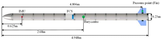 The appearance and dimensional parameters of the slender vehicle are depicted in Figure 4, which is the same as the test model in the reference [15]. The body is constructed with 14 sections of interconnected aluminum alloy cylindrical structures, featuring steel blocks for weight distribution at the connection points. Two horizontally movable control surfaces at the tail serve as longitudinal channel control surfaces. The total weight of the vehicle is 310.6 kg, and its pitch moment of inertia is 652.0 kg·m2. In ground experiments, aiming to simulate free-free boundary conditions as in airborne flight, a two-point spring suspension system was employed. The suspension points were positioned at the front and rear nodes of the first bending mode, and appropriate spring stiffness was selected to ensure the suspended rigid body frequency was much lower than the first elastic mode frequency. The measured pitch and plunge suspension frequencies were 1.10 Hz and 1.30 Hz, with damping ratios of 6.0% and 3.0%, respectively. Mode tests yielded the first and second bending mode frequencies of the slender as 18.0 Hz and 50.2 Hz, with corresponding damping ratios of 0.45% and 0.55%.