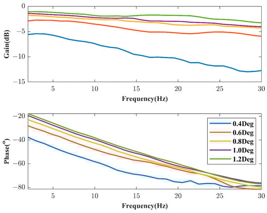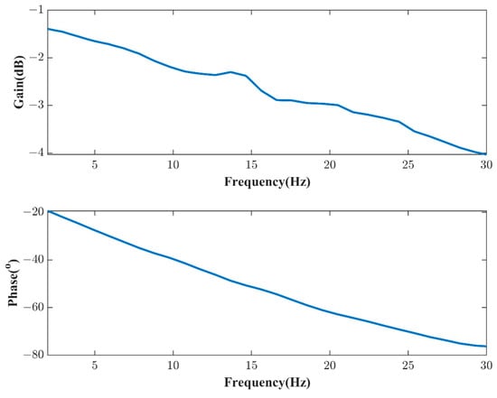 Generally, the frequency characteristics of the actuator under a command of around 1.0° better represent the real operational state of the control surface during airborne flight. Theoretical ASE analysis directly utilizes the obtained FRF of the actuator system from ground experiments, as illustrated in Figure 7. The FRF is identified using a step-sine signal with an amplitude of 1.0° as the deflection command. It is important to note that the actuator system in this paper is distinct from that presented in reference [15], which may impact the ASE stability analysis results.