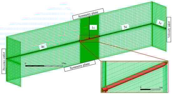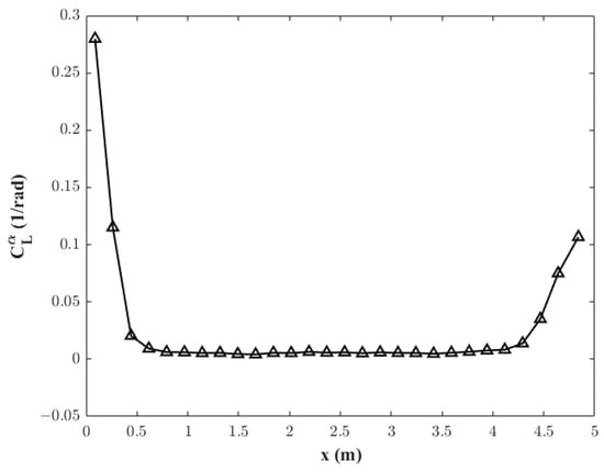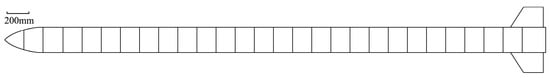 The quasi-steady aerodynamic derivative method is employed for the computation of aerodynamic forces. The body is segmented into 28 aerodynamic segments, with each control surface (right and left) treated as an independent segment, as illustrated in Figure 8. Utilizing a commercial CFD solver with the SST k-ω turbulence model and employing a second-order upwind scheme for numerical solving, the aerodynamic derivatives for each segment are computed. The structured mesh, which passes the grid independence test, is illustrated in Figure 9, where ‘c’ denotes the length of the slender vehicle and the total number of nodes is approximately 3.56 million. Considering sea level altitude and a Mach number of 0.5, the aerodynamic force acting on each segment is the resultant force from all its aerodynamic grids, with the projected areas of each segment in the X-Y plane serving as the segment’s area. The aerodynamic derivatives for each segment of the body are depicted in Figure 10, and the aerodynamic derivative for the control surface is 3.068/rad.
