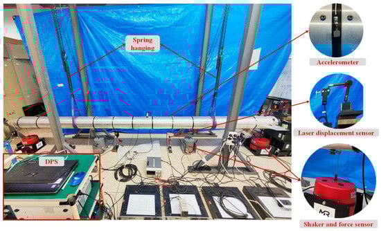 The experimental setup for the GAT is depicted in Figure 11. The slender vehicle is subjected to a simulated free-free boundary using spring suspension. The aerodynamic force loading on the four excitation points is accomplished by two MB Dynamics Model 110 shakers and two Model 50A shakers. Four force sensors (Kisler 9712b250) are employed to capture the actual excitation forces. Eight acceleration sensors (PCB 333B30) are utilized to collect vibration accelerations at the measurement points, and integration is applied to derive the vibration velocities at these points. The vibration displacements at the measurement points are measured using eight laser displacement sensors (OPTEX CD5-150). The DPS comprises a National Instruments real-time PXIe module and a computer running a data processing program (coded in LabVIEW), with a working cycle of 0.5 ms. An embedded controller (PXIe-8840) is used for two-way communication between the host computer and the PXIe module. A PXI multifunction I/O module (PXI-6229) is used to collect the acceleration, displacement, and force signals. The PXI-6229 is also used to output the input voltages of the power amplifier.