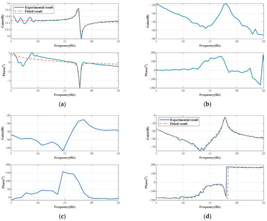To calculate the aerodynamic forces at the four excitation points under the critical state, we employed Simulink to build a time-domain simulation model for the slender vehicle’s GAT system. Under the C2 flight control law, when the ASE critical state is reached, the ratio of condensed aerodynamic forces at the four points satisfies . It can be approximated that the input voltages at these positions also follow this ratio. By calculating the coupling strength coefficients based on Equation (14), only . Therefore, it is required to consider the coupling from E4 to E1, and decoupling operations are needed. Figure 12 shows the fitted and , which match well with the experimental results, meeting the requirements for force controller design. Similarly, decoupling controllers can be obtained for the other three shakers. The final design results in a partially decoupled force controller, as follows: