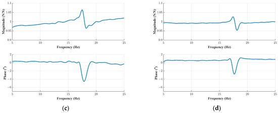 FRFs of expected force to actual force (the force controller enabled). (a) E1, (b) E2, (c) E3, and (d) E4.