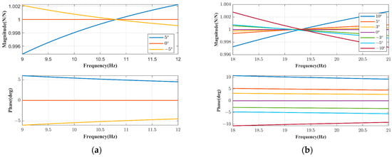 Under the C1 flight control law, appropriate parameters , , and were set to achieve specific deviations in excitation force amplitude at 10.8 Hz, namely 0%, ±5%, and ±10%, as well as phase deviations of 0° and ±5°. With an amplitude deviation of 0%, the network FRFs for various phase deviations are illustrated in Figure 15a. The results of time-domain simulation, including absolute error in gain margin and instability frequency, are listed in Table 1 and Table 2. The absolute error in gain margin is within −1.04~1.06 dB, and the absolute error in instability frequency is within −0.60~0.52 Hz.