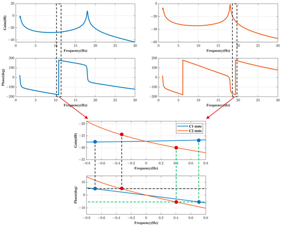 In light of the characteristics of the slender vehicle’s ASE system, we discuss the simulation results. Observing the Bode plots of the open-loop FRFs under flight control laws C1 and C2, as depicted in Figure 16. The Bode plots around the vicinity of the instability frequency for both states are magnified and depicted in a single graph. The plots are redrawn with the instability frequency set to 0 Hz and the unwrap phase at the crossover frequency set to 0°. It can be observed that in the C1 state, the instability frequency is far from the first bending mode frequency, resulting in relatively flat magnitude and phase curves. Conversely, in the C2 state, the instability frequency is close to the first bending mode frequency, leading to a steep magnitude and phase curve. In the locally enlarged phase-frequency curve, the positions corresponding to a 5° phase lag (indicated by the black dashed line) and a 5° phase lead (indicated by the green dashed line) of the excitation force are marked. The corresponding positions on the gain-frequency curve are also indicated. A 5° phase lag corresponds to the original location, with a 5° phase angle in the phase-frequency curve becoming the new instability frequency point (phase angle 0°). It can be observed that the difference in slope causes a larger instability frequency error for the C1 state compared to the C2 state under the same excitation force phase deviation (±5°). However, C2 exhibits a larger absolute error in the gain margin.