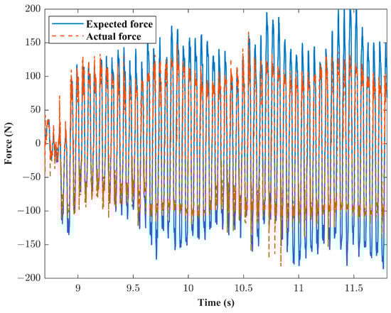 At a flight speed of 170 m/s and an atmospheric density of 1.225 kg/m³ (corresponding to a flight dynamic pressure of 17.7 kPa), the ground experiments were conducted for two sets of flight control laws, C1 and C2. When the vehicle was in a critical state, it exhibited near-harmonic vibration; however, accurately capturing this state in experiments proves challenging. Taking the example of the C2 state, the comparison between the expected and actual forces at E4 is illustrated in Figure 17. The excellent agreement between expected and actual forces verifies the effectiveness of the designed force controller.