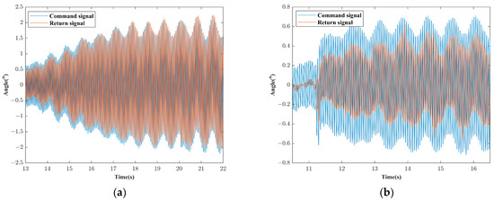 Angle of the actuator at different flight dynamic pressure. (a) 17.7 kPa, and (b) 93.2 kPa.