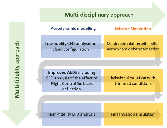 This section discloses the step-by-step methodology developed in the framework of the H2020 MORE&LESS project. A multifidelity and multidisciplinary approach is followed, where each step of the design phase involves multiple analyses with equal level of details. For the purpose of this paper, the main focus is on the aerodynamic modeling and mission simulation, as shown in Figure 1. The aerodatabase of a generic high-speed civil aircraft considered in the framework of the project is built starting from preliminary aerodynamic data obtained by means of inviscid CFD up to a final and more reliable aerodatabase setup with viscous CFD and experimental measurements and associated confidence level bars. In parallel with the aerodynamic analysis, mission simulation is run at each stage of the design phase, to have a fast and reliable estimation of the vehicle performance along the reference trajectory. The mission simulation, commonly regarded as the ultimate validation of a given concept, is exploited here from the early design phases, guaranteeing accuracy in estimating nominal ranges, fuel mass, fuel reserves, etc., at every stage of the design process.