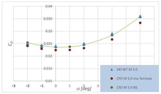 Drag coefficient at Mach 5 of VKI WT CS2 vehicle. Comparison between WT data (1st line of legend), inviscid CFD with viscous correction (2nd line of legend), and direct viscous CFD (3rd line of legend).