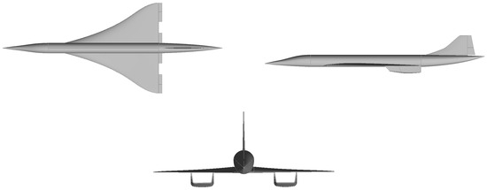 The CS-1 vehicle (Figure 4) is a Concorde-like commercial Mach 2 aircraft very similar to the well-known, out-of-service Aérospatiale-BAC Concorde. The main geometrical quantities are the same; in particular, a total length of 62.3 m, a wing span of 25.60 m, and the following reference quantities: Sref = 332.6 m2; Lref = 27.66 m.