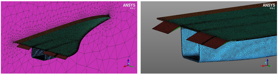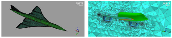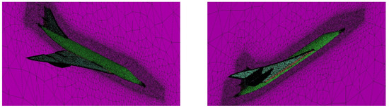 The clean configuration low-fidelity data were obtained using an unstructured grid of 2.1 million of cells for half-configuration (longitudinal analysis) generated by means of the ANSYS-ICEMCFD-TETRA® grid generator (Figure 5) and the use of the commercial code Ansys Fluent®. The Euler equations (mass and momentum balances without viscous contributions) were numerically resolved and coupled with a compressible perfect gas state model to close the full system of equations. The following boundary conditions were applied: wall: slip for velocity (null normal component), adiabatic for thermal treatment; and classical far-field conditions for other surfaces of the CFD domain. Particular attention must be given to the modeling of the engine boundary conditions; in particular, the internal flow path of the nacelle was not calculated and the interaction is managed by means of applying the surfaces that act as outflow and inflow for the CFD control volume (Figure 6).