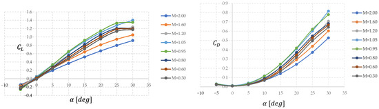 From Figure 7, Figure 8 and Figure 9, where all predicted aerodynamic coefficients are reported, a different behavior can be observed for subsonic and supersonic regimes. In particular, the stall phenomenon starts at an angle of attack of 25° in the subsonic regime, whereas for the supersonic one, a quasi-linear trend seems to continue for higher angles of attack.