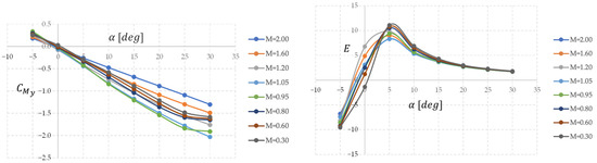 Pitching moments and aerodynamic efficiency versus angle of attack for all Mach numbers.