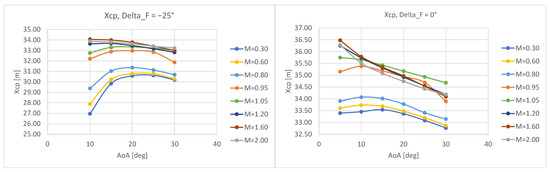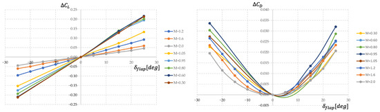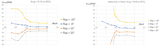 The trim can be obtained by acting on three different control surfaces as reported in Figure 10. A simplified approach was followed to characterize the control surfaces and reduce the amount of CFD calculations. A standalone wing configuration was considered with several flap deflections (Figure 10). A quasi-linear trend can be found for Delta_CL and a quadratic one for the Delta_CD versus flap deflection (Figure 11). The range of trimmability for a center of gravity located at 50% of the total aircraft’s length can observed in Figure 12; it reduces going from lower to higher Mach numbers. This is due to the fact that the center of pressure retreats toward the tail (Figure 13), thus making the trimmability (higher flap deflection to obtain the same angle of attack) harder. The trend of flap deflection versus the desired trimmed angle of attack is reported in Figure 14 for two different center of gravity (CoG) locations (31 and 33 m, i.e., 50% and 53% of total length), where the reduced trimmability range is confirmed at higher Mach number (Figure 14, left). This behavior at the supersonic regime can be alleviated by shifting the center of gravity toward the tail as it happens for the center of pressure (Figure 14, right). A variable center of gravity along the trajectory seems to be necessary. This behavior is clearer in Figure 15, where the angle of attack of trim is reported versus the Mach number at several flap deflections. A drastic reduction of possible angle of attack can be seen for a center of gravity at 50% of the length (Figure 15, left). The shift of CoG at 53% (Figure 13, right) slightly enlarges the transonic–supersonic region but makes the subsonic regime unstable (the range of trim is outside the figure).