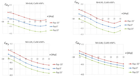 Upon establishing a preliminary layout for the control surfaces, attention must shift towards selecting deflections to ensure that trim conditions are maintained throughout the mission, thereby minimizing adverse effects on the overall efficiency of the vehicle. For a given Mach number and position of the center of gravity, the different control surface deflections are taken into account to analyze the aircraft stability and trim. First, the aircraft stability is verified, checking if the slope of the pitching moment curve, as a function of the angle of attack , is lower than zero. Then, the trim conditions are computed, imposing .