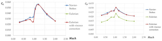 where the viscous contribution to the drag () can be estimated by correcting the turbulent flat plate theory (represented by the term ; see [33,34], where Re is the Reynolds number) with (i) the factor (M: Mach number) which takes into account the compressibility effect, and with (ii) the wetted-to-reference area ratio. The parameters , , and can be customized depending on the vehicle configuration. For example, the values , and were found for the STRATOFLY MR3 configuration [30]. Moreover, a preliminary direct comparison of the results of the previous formulations with both viscous CFD and experimental measurements can be found in Figure 2, where the drag coefficient of another vehicle of the MORE&LESS project (CS2 of Figure 3) is reported (less than 7% difference).