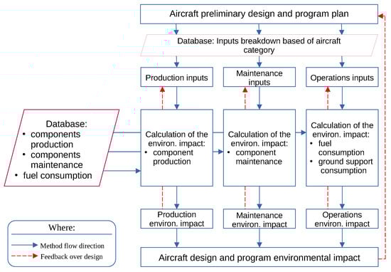 Starting from these two statements, the assessment method develops the following characteristics. The first one is a general approach which requires minimal changes in order to adapt to aircraft of different categories. This is because it is based on parametric equations that use information from preliminary design as the input. The second characteristic is the level of detail, since all phases of the aircraft’s life are considered and broken down as follows: production, operations, maintenance and end of life. In addition, for each of the phases, the required data are simultaneously specific and well-defined at the preliminary design stage, e.g., the aircraft is divided into systems, subsystems and major components, and an environmental impact is associated with each of them. Lastly, there is a possibility to analyze innovative architectures, e.g., hybrid electric aircraft, due to the consideration of new technologies in the database. From this perspective, fuels that can be assessed are kerosene based, biofuels, liquid hydrogen and electricity. All the consequently changes into operations phase are also considered.