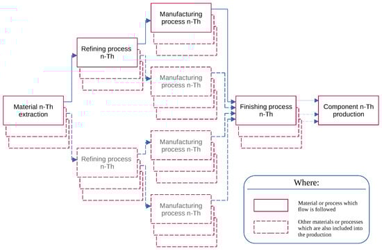 Firstly, the path followed to build the dataset used in the model has to attempt to derive it directly from the values clustered in the Ecoinvent database. However, this has been possible for a limited number of components. The reason for this is that one of the most important sources of information for the Ecoinvent database is the automotive world. Nevertheless, even if automotive components are quite similar to those of aerospace, they are manufactured in a completely different way since aircraft requirements are much more stringent, and their environmental impact is different as a consequence. Thereby, using Ecoinvent data as a starting point, every major part of the aircraft has been modeled starting from the constituent materials. Then, to each of them has been associated with one or more manufacturing process until the finishing processes. In this way, for each component, it has been possible to build a fairly well-stocked database, including all major parts. The procedure is visually explained in the following Figure 2.