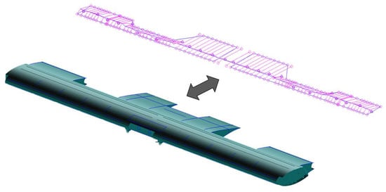 Stick-beam models, commonly employed in civil aircraft design and multidisciplinary design optimizations (MDOs) [11], offer a quicker alternative for dynamic analysis, but at the cost of reduced result fidelity. The accuracy of stick-beam models depends on the evaluation of stiffness properties, including the main structure and the elastic axis of the beam elements. Various methods, such as those outlined in Refs. [11,12,13], have been proposed for stiffness and mass matrix reduction, but they often lack precision in determining the physical distribution of parameters along the real structure.