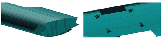 The main innovations regarding the wing structure concern the highly integrated composite concept [4,5,6] and the presence of two mobile surfaces: one is an external flaperon while the other is a so-called morphing surface, which has the function of reducing the exposed wing area on the wing of the propellers’ slide in a helicopter mode. All of these characteristics lead to a rather compact wing structure since the largest moving surface extends to almost half of the wing chord.