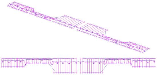 Stick-beam model of the wing-box. (Top): 3D view; (Bottom): top view.