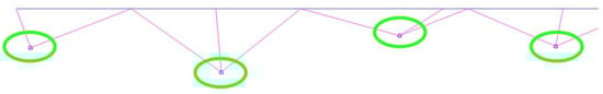 Coherently with the GFEM wing-box, no density has been defined for the stick-beam elements since the mass has been applied to the structure by means of concentrated masses (same CONM2 elements used for the GFEM) connected to the wing-box via interpolation elements (MSC Nastran RBE3 elements). In Figure 8, it is possible to see the wing concentrated masses, highlighted in green, connected to the wing beams (blue lines) by means of RBE3 elements (pink lines).