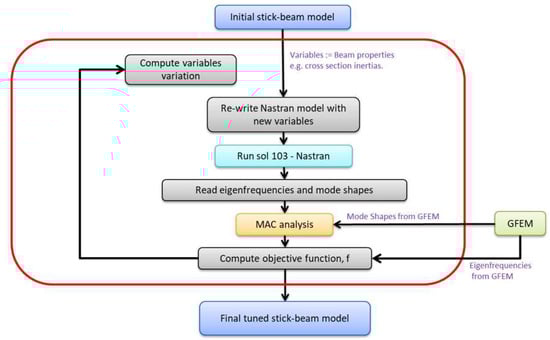 The methodology adopted for the tuning process is summarized in Figure 9. The optimization starts with an initial guess of the variables (beam properties contained in the stick-beam model output of a static condensation), re-writes the Nastran model with these variables, runs a modal analysis (Nastran Sol-103) and reads the eigenfrequencies and mode shapes. Finally, it selects frequencies and mode shapes of the modes of interest (target modes) via a MAC analysis and computes the new objective function. In case the iteration does not comply with the convergence criteria, a new guess of the variables is estimated as a function of the gradient and Hessian of the objective function.