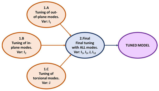 Considering the geometry of the stick-beam model (i.e., no sweep, dihedral and incidence angles), bending modes are mainly driven by the out-of-plane area moment of inertia I1, fore–aft modes are mainly driven by the in-plane area moment of inertia I2 and torsion modes are mainly driven by the polar moment of inertia J. Therefore, as shown in Figure 10, the optimization tool has been set up to perform, as a first step, three parallel tunings (1.A, 1.B and 1.C) which help to find a better guess of the variables I1, I2 and J. As a second step, a main tuning (2.Final) is performed, involving all the variables of the problem (I1, I2, J, I12) simultaneously.