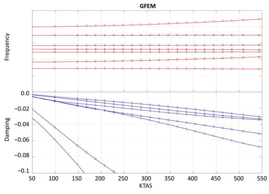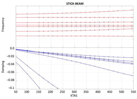 The calculations have been carried out at Mach number 0.40 at sea level, and all the modes with frequencies smaller than 40 Hz have been considered. The V g diagrams of the GFEM model and the stick-beam model, considering for the plots the target modes only, are shown in Figure 15 and Figure 16, where the blue lines and the red lines represent, respectively, the modal damping and the modal frequency of each mode depending on the flight speed.