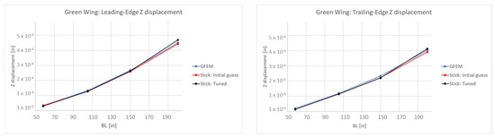 Table 10 summarizes the percent errors in the vertical displacements of the wing tips of the different models, reporting the percent errors in terms of the difference between the vertical wing tip displacements on the leading edge and trailing edge of the initial guess stick-beam model and tuned-wing stick-beam model with respect to the vertical wing tip displacement of the GFEM wing.