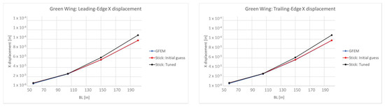 Table 11 summarizes the percent errors in the horizontal displacements of the wing tips of the different models, reporting the percent errors in terms of the difference between the horizontal wing tip displacements on the leading edge and trailing edge of the initial guess stick-beam model and tuned-wing stick-beam model with respect to the horizontal wing tip displacement of the GFEM wing.