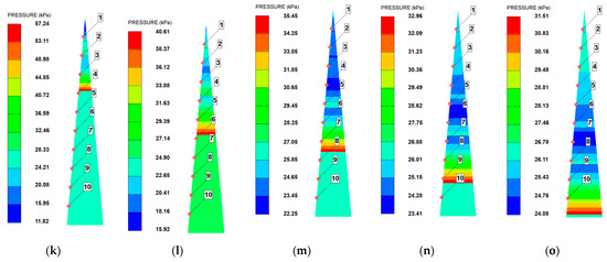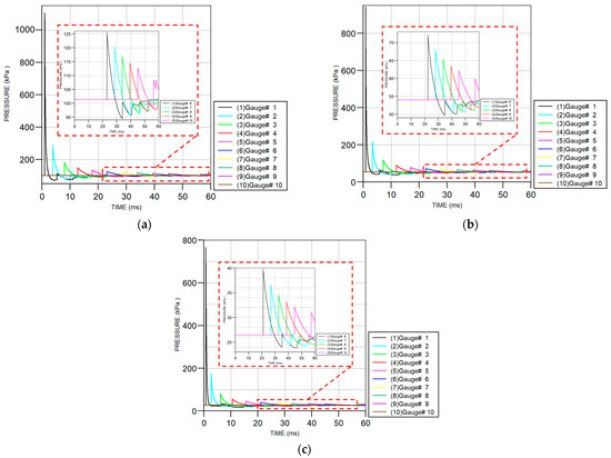 When analyzing the pressure–time history curve of each group of working conditions, the peak pressure of each observation point could be obtained by extracting the maximum value of the pressure–time history curve, as shown in