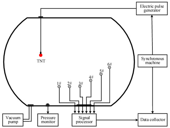 Figure 7. The experimental system included the initiation system, pressure testing system, and low-pressure environment simulation system. The initiation system was composed of a synchronous machine, high voltage pulse generator and a detonator. The pressure testing system included a free field shock wave sensor arranged in the tank and its matching signal adjuster and a data recorder. After detonation, the pressure signal measured by the sensor was transmitted to the signal adjuster, and the micro charge signal obtained by the sensor was amplified and finally stored by the data recorder. The low-pressure environment simulation system consisted of a vacuum pump and a pressure monitoring device. By using the vacuum pump to draw air from the tank to create a low-pressure environment, the pressure could be adjusted according to the pressure monitor reading to achieve the pressure level required by the experiment.