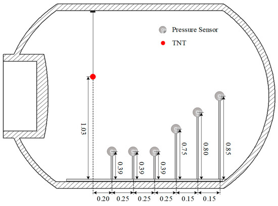 Spherical TNT explosive was used in the experiment, and the initiation mode was center initiation. The TNT explosive was divided into the upper and lower hemispheres. A groove was reserved in the lower hemisphere to place the booster charge, and a detonator placement hole was prefabricated in the upper hemisphere. The upper and lower hemispheres were bonded with glue before initiation, and the spherical charge was hoisted at a predetermined position and fixed after being combined. The sensor was welded to the steel plate at the bottom of the tank body through a screw. The height of the sensor and the direction of the sensitive surface could be adjusted through the fixing nut at the top of the screw. During installation, the direction could be adjusted so that the shock wave front was perpendicular to the disk plane. The height of the sensor could be adjusted to avoid the impact of the Mach wave formed on the ground and the reflected wave formed by the other walls on the incident shock wave, so as to ensure that the sensor could completely record the pressure–time history data of the positive pressure area of the incident wave. The distribution of measuring points of the pressure sensor is shown in