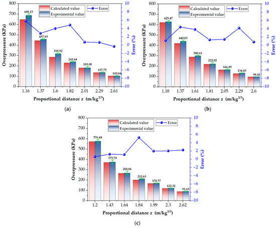 h= 0.5 km, 2.5 km, and 4.5 km, were obtained through the tests. Since there were 72 sets of experimental data in total, 42 representative sets of experimental data were selected for more efficient analysis. These 42 sets of data corresponded to 292 g (#2, #5, #6) and 106 g (#1, #3, #5, #6), respectively. These 42 sets of experimental data better covered the proportional distances from 1.2 to 2.6, and the spacing of the proportional distances was relatively uniform. The explosion shock wave overpressure peaks at different proportional distances could also be calculated based on the rapid evaluation Formula (10). The experimental and calculated values, as well as the errors between them, are shown in