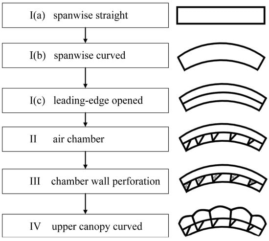 Model I(a) shows the original NACA parafoil canopy. Model I(b) has a spanwise curving. Model I(c) makes a leading-edge opened, and the entire interior chamber became one large chamber; Model II divides the parafoil air chamber into separated small chambers. In the model III, walls of the air chambers are perforated. Model IV has the highest extent of surface curving. It curves the upper canopy of each chamber individually.