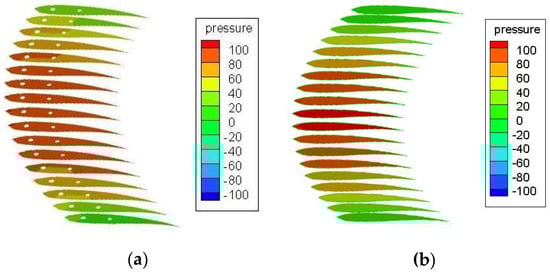 Pressure nephogram in profile Z = 4000 mm (α = 20°). (a) Model I(c); (b) Model III.