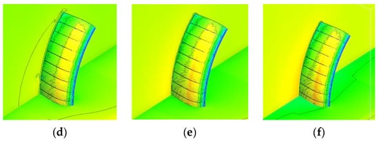 The pressure nephogram of the canopy and the X = −2, Y = 0 pressure streamline are shown in Figure 8. The transition between the flow streamline and the nephogram at the connections of the air chambers caused by the caving-in part of the canopy in the final aerodynamic shape model of the curved parafoil was more complicated, showing signs of stagnation in the flow pattern at the caving-in connections, which was quite different from the model I.