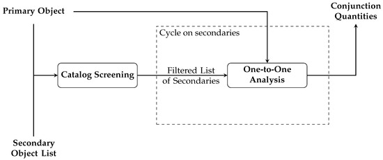 The present section provides an insight into the algorithms included in the conjunction analysis software, except for the CAM planning module, which is described in more depth in Section 5. First, a pre-processing phase is run to manage the input data before the conjunction analysis process begins. In particular, the objects’ ephemerides are evaluated at the starting epoch of the time interval of the analysis, which is set either by default or according to a specific request by the user. In addition, if no covariance is associated to an input object, this is attributed through the method presented in [28]. Then, a catalog screening is conducted, which allows the overall computational demand to be reduced. Subsequently, a one-to-one analysis for the pairs passing the filters computes the essential conjunction parameters introduced in Section 1. The overall process is represented in Figure 2.