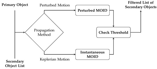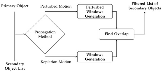 The overall OP filter workflow is represented in Figure 4. Given that it is the last filter of the sequence, and that the pairs passing it have already passed the T filter, temporal considerations can be made to extract useful information about the TCA. As also remarked by Hoots et al. [29], the interval of interest in which to analyze the relative motion between the two objects may be shortened to those intervals identified by the T filter. In this regard, being that the time windows of the T filter have been generated around portions of the orbits close to the line of intersection, that is in proximity to the MOID, this allows the epoch of transit of one of the two objects through the MOID to be considered as a candidate TCA.
