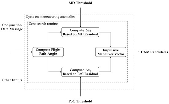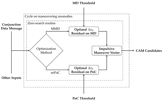 These operations are performed for all the true anomaly candidate locations given as input, and, for each of them, the process returns the minimum cost maneuver which matches either the desired MD or PoC. Finally, all these maneuver candidates are ranked based on the impulse magnitude . The overall process is represented in Figure 5.