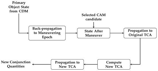 The CAM planning procedure described above is based on [34], which exploits a Keplerian assumption. Thus, if requested by the user, the performance associated with a specific maneuver (selected from the list of candidates) shall be verified also considering orbital perturbations. A reasonable way is to start verifying the compliance of the minimum cost CAM, that is, the candidate featuring the smallest impulse magnitude, or the maneuver associated with one of the locations that best suits other possible users’ needs. To this end, the primary object orbital state, which is defined at the TCA (being given by the input CDM), is back-propagated to the maneuvering epoch. This step is accomplished according to a high-fidelity propagator which considers orbital perturbations. Then, the maneuver to be verified is applied, and the state after the maneuver is propagated to the original TCA. Given that the primary object follows a new trajectory after the maneuver, updated conjunction quantities are computed: the original TCA is used as the first guess to compute the new TCA, to which both primary and secondary objects are propagated, and the new MD and PoC are computed. If they do not respect the threshold quantities, the user can opt to select an alternative CAM among the candidates (for instance, the next in the ranking), to then verify its compliance through the refinement process. The CAM refinement process is represented in Figure 7.