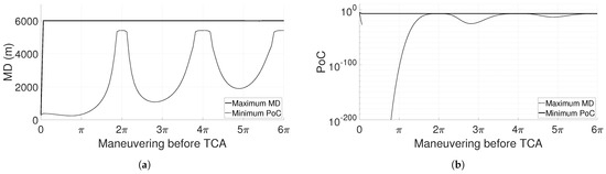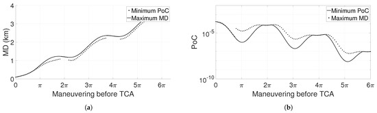 Real test results for the optimal CAM planning: MD and PoC trends. The plots report the MD (a) and PoC (b) trends as a function of the maneuvering point before the TCA, expressed in true anomaly difference. It is possible to notice that the MD and PoC align with the values in the MMD and mPoC maneuvers, respectively.