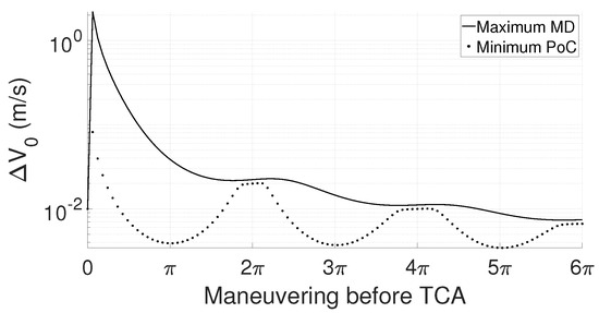 Figure 10 displays the resulting values of the optimized impulse magnitude as a function of the maneuvering anomaly. As expected, the figure shows that the earlier the maneuver with respect to the TCA, the lower the required impulse. The peak near zero degrees indicates that the impulse needed to meet the thresholds by executing a maneuver very close to the conjunction anomaly would be very expensive.